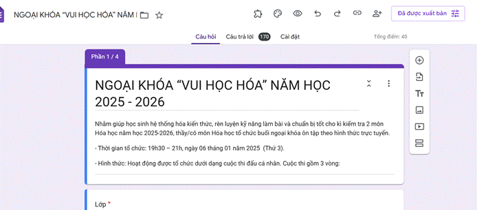 Vào lúc 19h30 – 21h00 (tối thứ 3), ngày 06 tháng 01 năm 2026. Các thầy/cô môn Hóa học (Tổ BM Tự nhiên) – Trường Dự bị đại học TP. HCM đã tổ chức buổi ngoại khóa trực tuyến với chủ đề “Vui Học Hóa”. thông qua công cụ Google Form, tạo thuận lợi cho học sinh tham gia đầy đủ, gây nguy hiểm và hiệu quả.